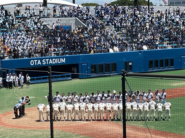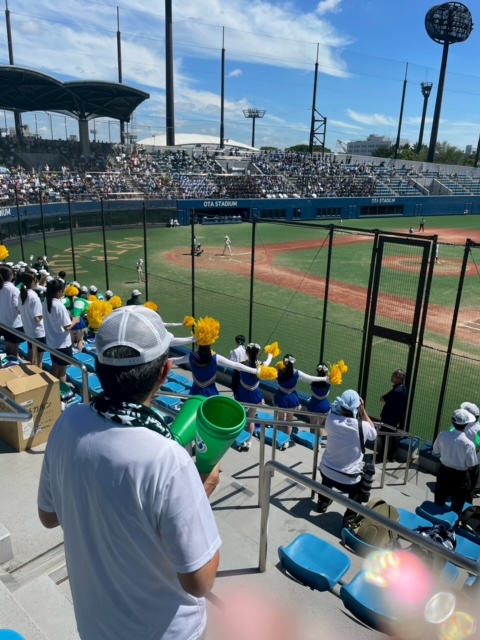 この日も9時開始の試合とはいえ、朝から猛烈な日差しが照り付けるなかで、二松学舎大学附属高校応援スタンドは、多くの観衆、そして多くの皆さんに緑色のTシャツを着用いただき、「緑色の一体感」で選手達へ勇気づけることができました!改めて後援会会長としてご賛同いただいた皆さんへ感謝申し上げます。本当にありがとうございました。