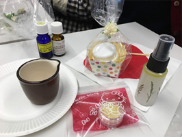 アロマテラピー、精油についての説明の後、ミツロウクリームとアロマスプレー作りにとりかかりました。先生の説明と資料から、参加者それぞれが自分好みの香りと効能を選び、世界に一つだけのオリジナルアロマグッズを作りました。